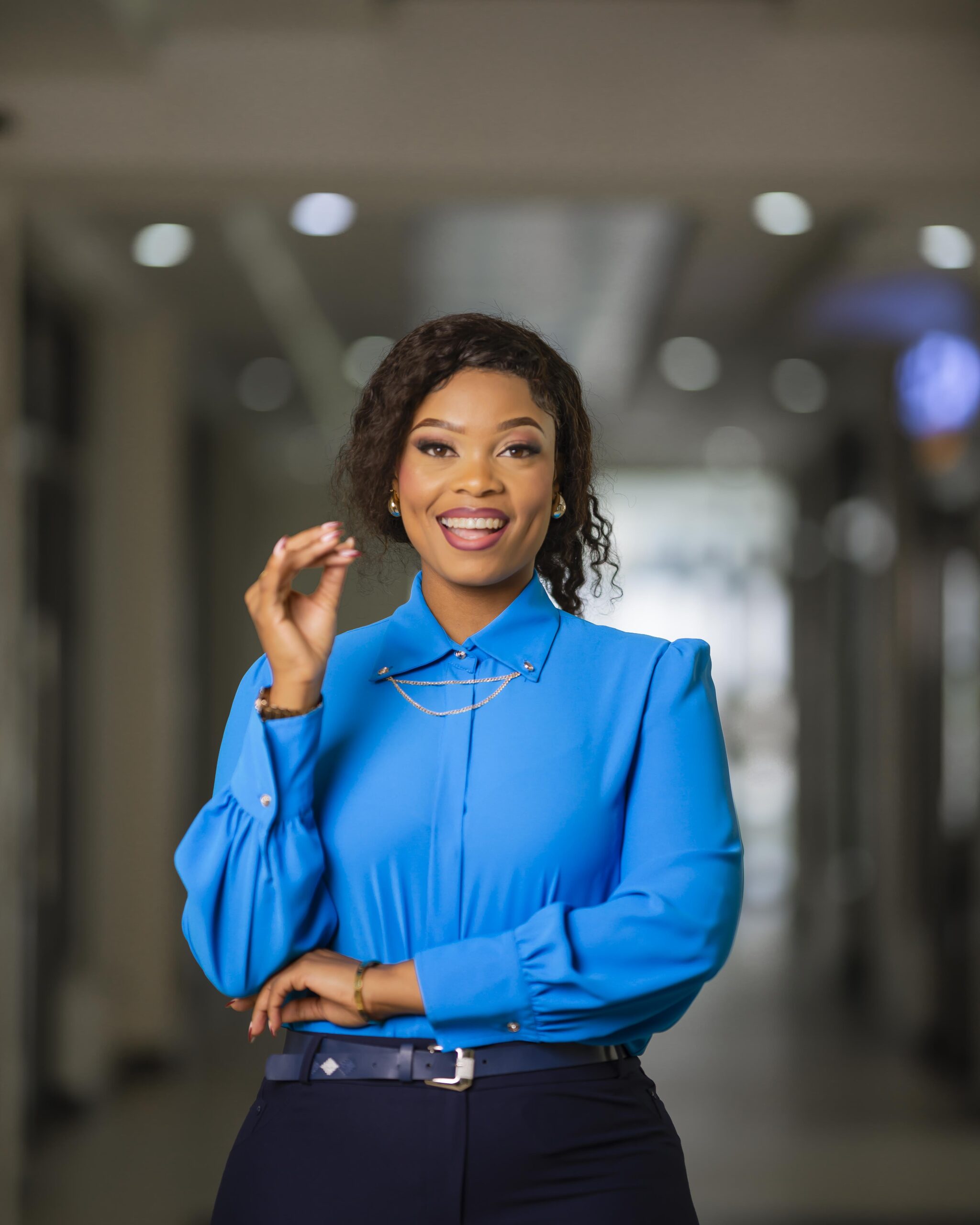 A blue blouse made of a high-quality fabric with a great feel. Can be paired with both a skirt or pants bottom for an elegant official or smart casual look.